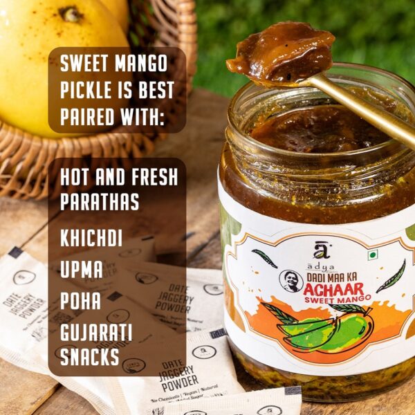 Authentic Family Recipe: The USP of Adya Organics’ Dadi Ma Ka Aam Ka Achaar (Sweet Mango – Gudamba) lies in its authentic preparation, reflecting the cherished taste of grandma’s homemade sweet mango pickle.